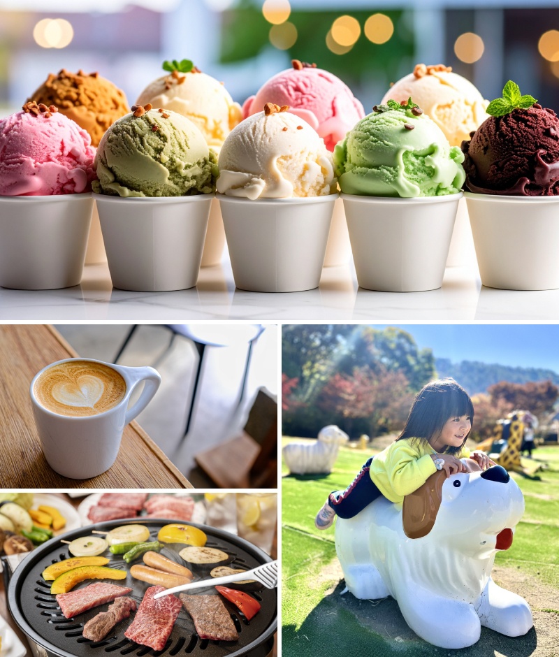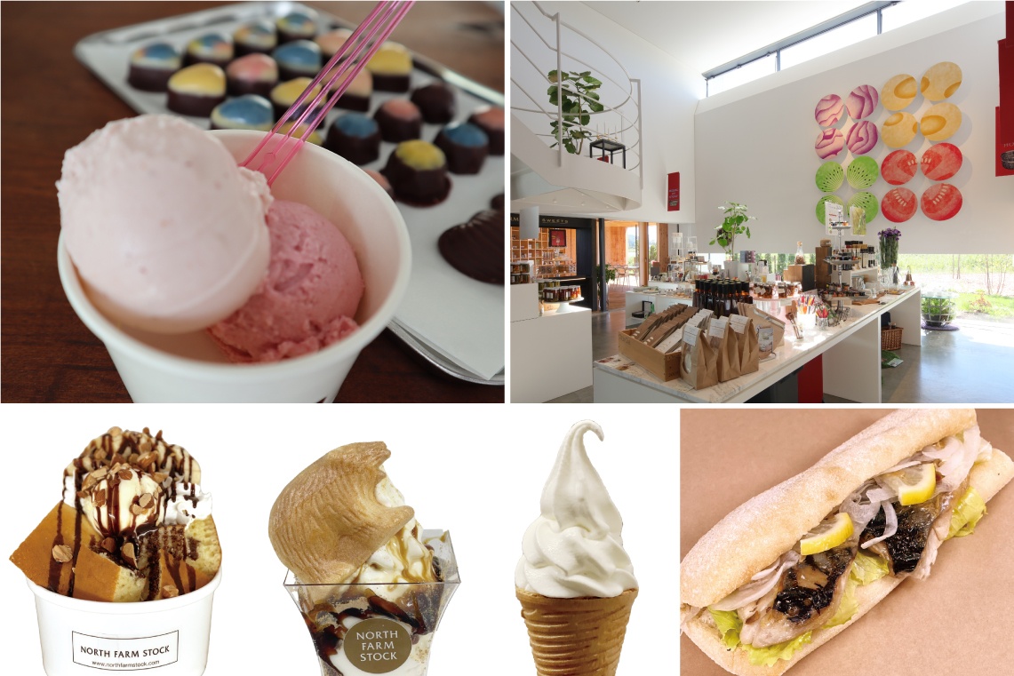 ひときわ目を引くお洒落な外観。店内は広々として2階はカフェスペースです。お勧めはソフトクリーム。興部産の牛乳を使用していて、甘く濃厚なミルクでキメ細かく上質。メープルコーンと相性も抜群。様々な味が楽しめるプチパフェも人気。他にジューシー鯖サンドなどフードメニューも充実しています。